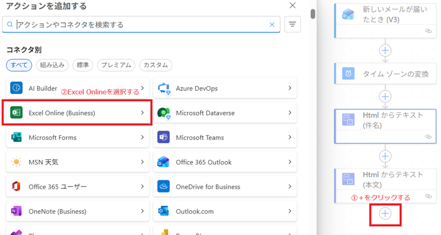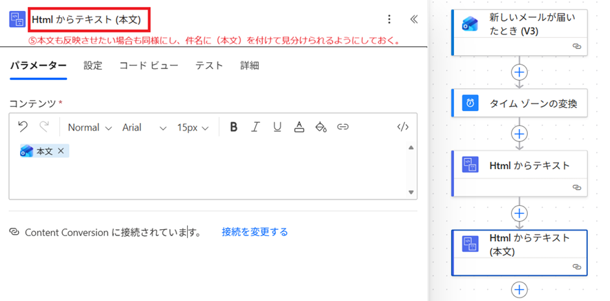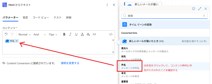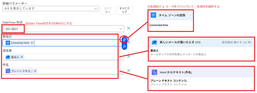 ⑦受信日は、⚡マークを選択し、タイムゾーンの変換(Converted time)を選択し、送信者は、新しいメールが届いたとき(V3)の差出人を選択し、件名は、Htmlからテキスト(件名)のプレーンテキストコンテンツを選択する。