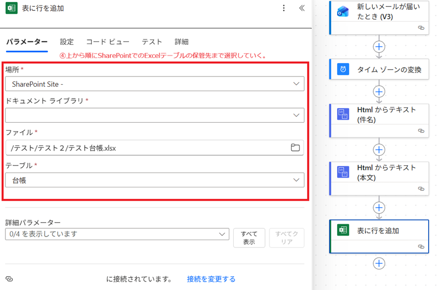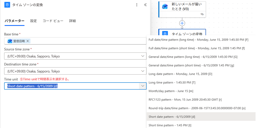 ③パラメータータブのBasetimeを新しいメールが届いたとき(V3)の受信日時を入力する。