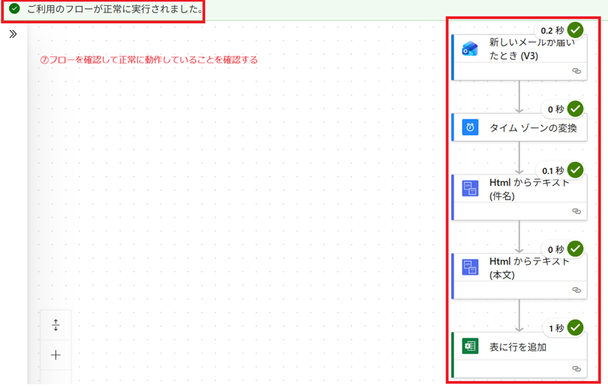 ⑦PowerAutomateも確認すると、「ご利用のフローが正常に実行されました。」となり、正しく反映されたことが確認できます。
