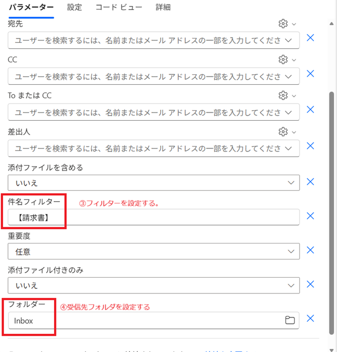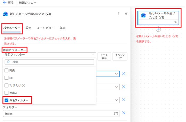 ②パラメータータブの詳細パラメーターで件名フィルターにチェックを入れて、表示させる。