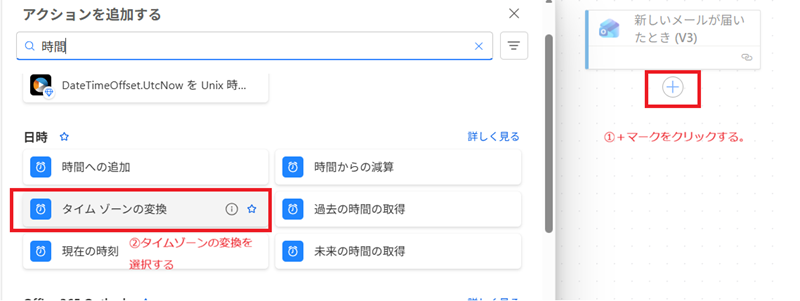 ②アクションを追加するでタイムゾーンの変換を選択する。
