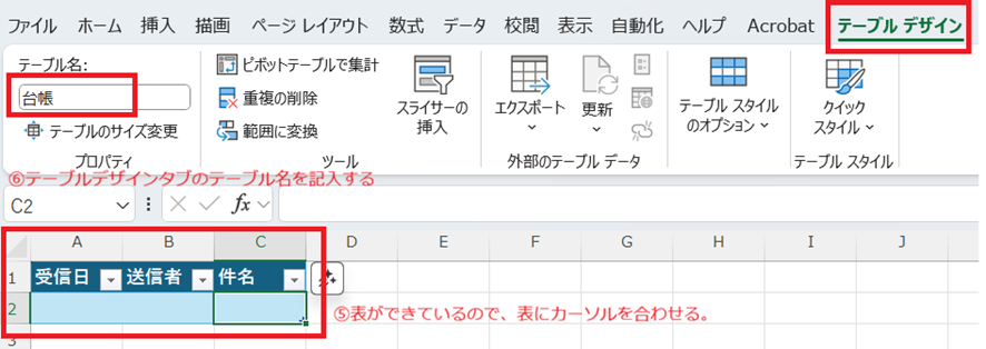 ⑥テーブルデザインタブのテーブル名を台帳と記載する。