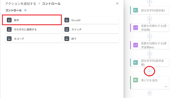 3)表に行を追加するをドラッグして条件に入れる。