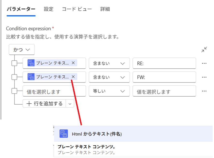 2)パラメーターには以下のようにHtmlからテキスト(件名)→含まない→RE:やFW:という順番で入れていく。