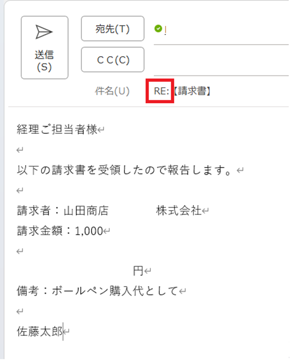 では、テストしてみましょう。件名にRE:が入っているものを送信します。