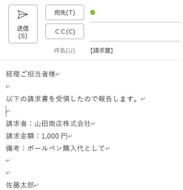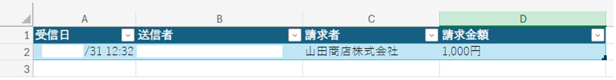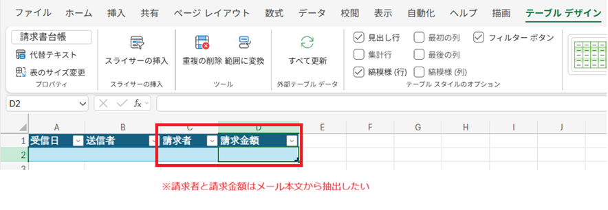 このとき、Excelファイルの各項目は、受信日、送信者、請求者、請求金額とします。受信日はOutlookメールを受信した日、送信者はメールの送信者としますが、請求者と請求金額は、次のとおりメール本文の一部から抜き出します。