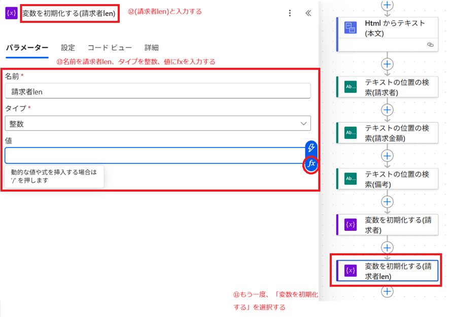 ⑬パラメーター内には、名前は「請求者len」、タイプは「整数」、値としてfxマークを選択する。
