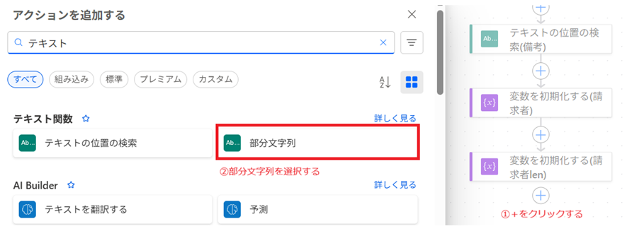 初めて聞くと、よくわからないかと思いますので、今後の流れとして、「テキストの位置の検索→変数を初期化する→部分文字列」となることくらいを理解しておいてください。