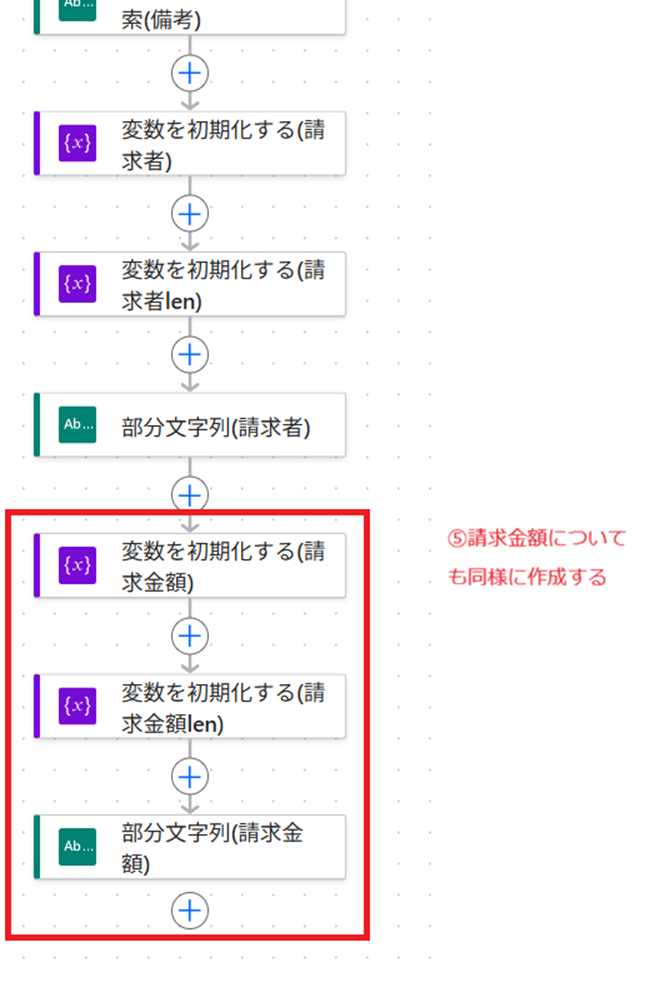 ⑤変数を初期化する(請求者)→変数を初期化する(請求者len)→部分文字列(請求者)の一連で「請求者:」後の文字が抽出できるので、同様の作業を請求金額についても行う。