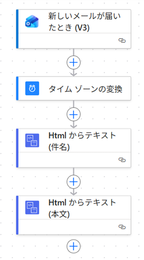 新しいメールが届いたとき(V3)→タイムゾーンの変換→Htmlからテキスト(件名)→Htmlからテキスト(本文)までを作成する。