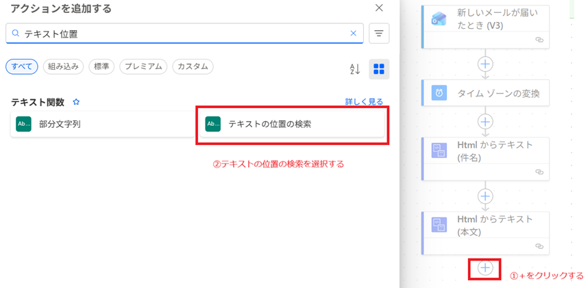 ①「テキストの位置の検索」直下のプラスをクリックする。