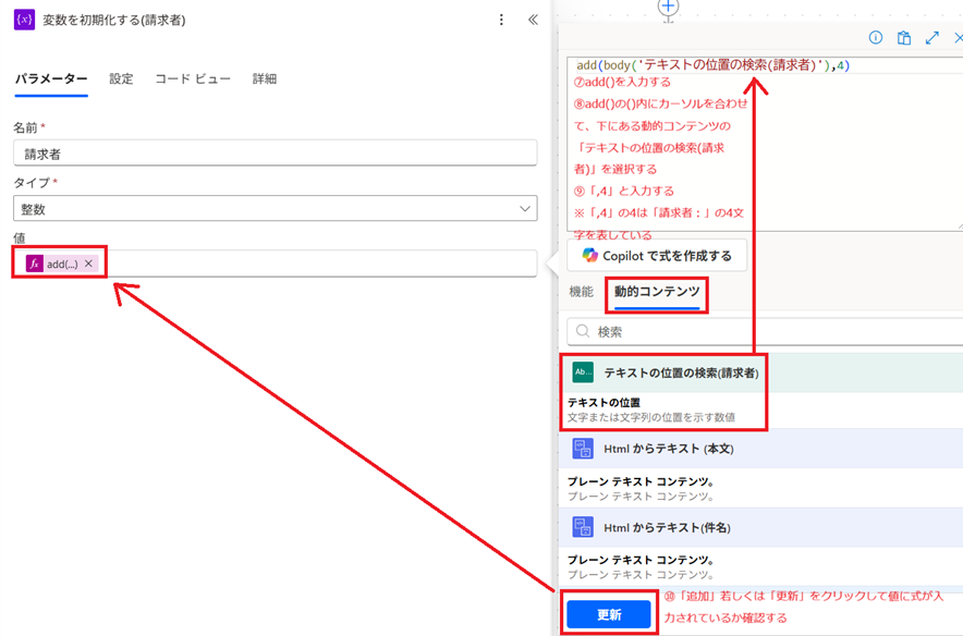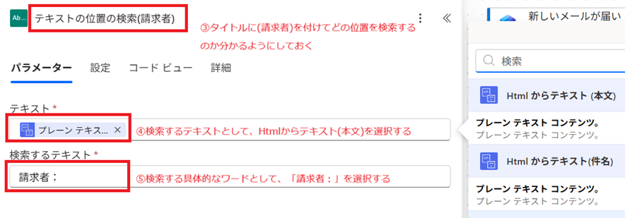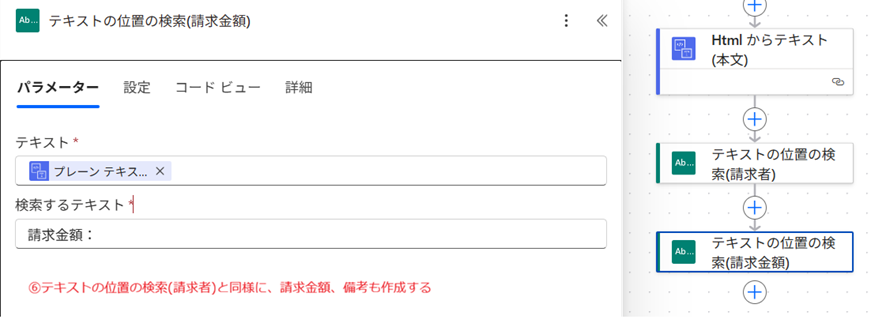 ④パラメーターのテキストには⚡マークをクリックしてHtmlからテキスト(本文)を選択する。開始位置は、⚡マークから変数(請求者)を選択する。詳細パラメーターから長さを表示させて、⚡マークから変数(請求者len)を選択する。