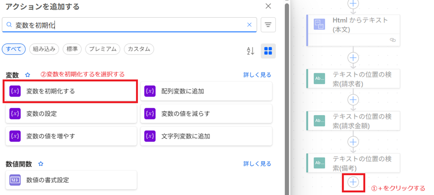 ①変数を初期化する(請求者len)の直下の+をクリックする。