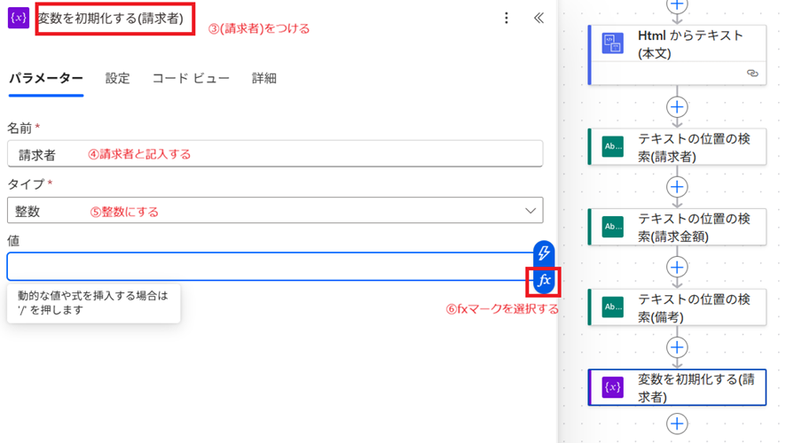 ③詳細パラメーターを表示させ、入力していく。請求者には部分文字列(請求者)、請求金額には、部分文字列(請求金額)を追加する。